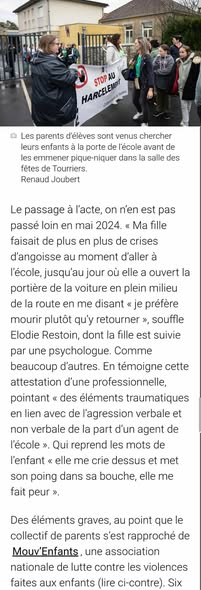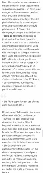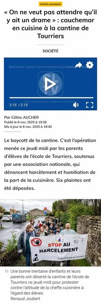 Nous, parents d’élèves de l’école de Tourriers, réunis au sein d’un collectif depuis octobre 2024, et l’association Mouv’Enfants, fondée par Arnaud Gallais et engagée dans la lutte contre les violences faites aux enfants, vous adressons cette lettre ouverte en réaction à votre silence et à vos propos tenus dans l’article de Charente Libre publié le 6 novembre 2025 autour de notre mobilisation ‘Cantine morte’.